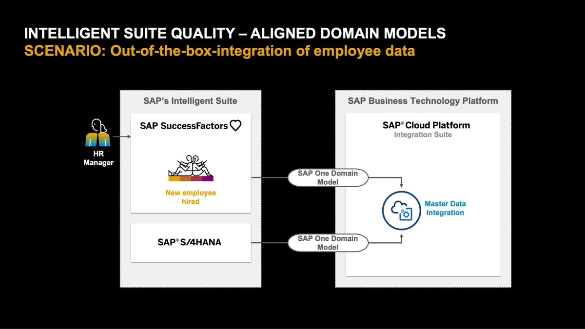 This demo shows how the out-of-the-box-integration of a newly added employee works between SAP SuccessFactors and SAP S/4HANA. Behind the scenes the aligned business object "WorkforcePerson" from SAP One Domain Model is used to synchronize the newly added employee with SAP S/4HANA using the SAP Cloud Platform Master Data Integration service.